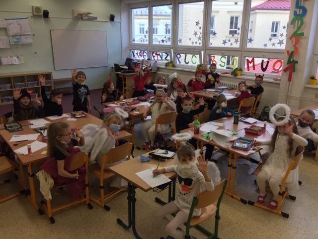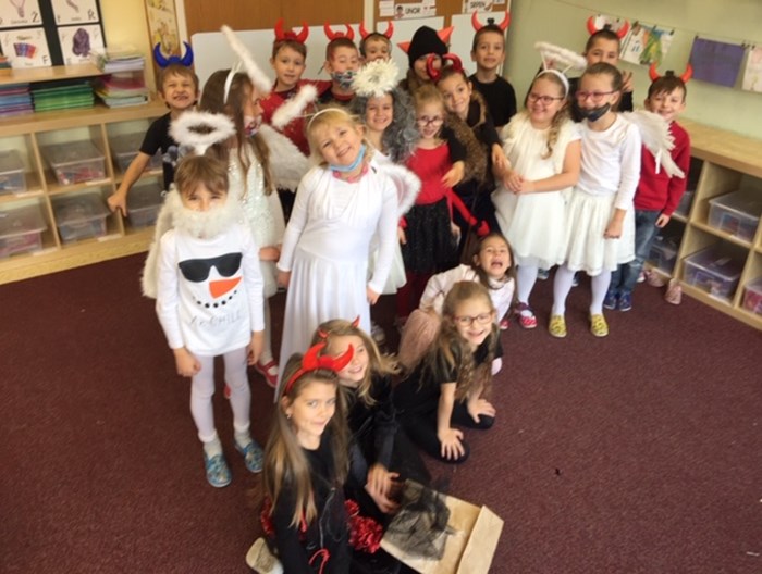 Kluci a holky z 1.B se na dnešní dopoledne proměnili v čerty, čertice a anděly.