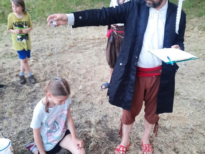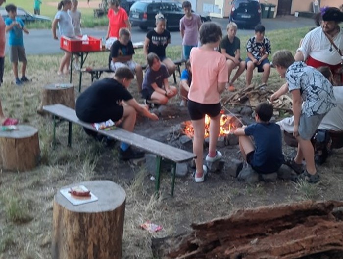 Odpolední program od úterý patřil pirátům z Fokusu v čele s panem Podžorným . Děti řešily řadu kreativních úkolů a u čtvrtečního táboráku pak byly pasovány za bukanýry.