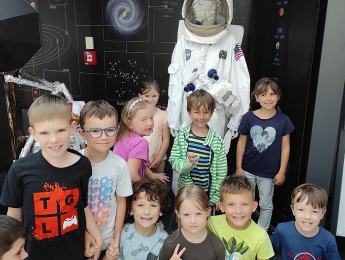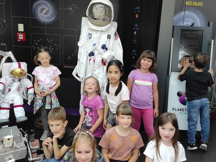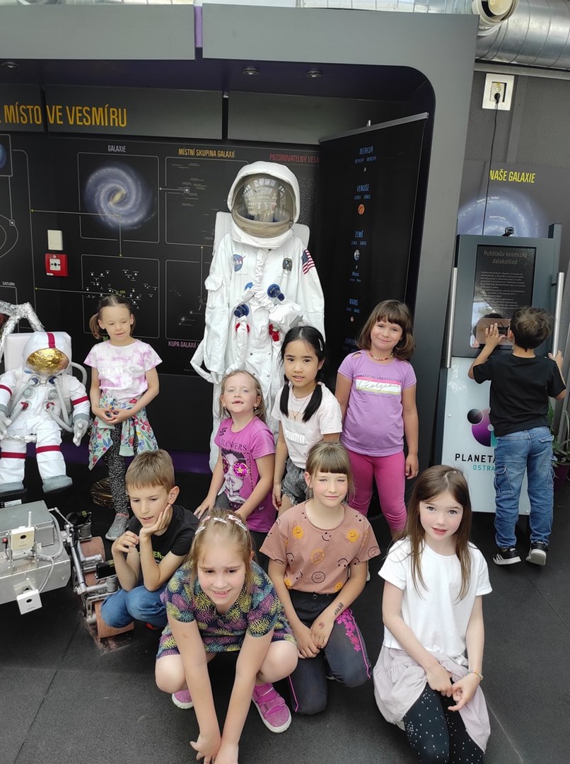 Červen již tradičně patří školním výletům, a tak se na svůj první velký výlet 8. června vydaly i děti z 1.A a 1.B. Čekala je návštěva Planetária v Ostravě. Většina z nich nikdy v planetáriu nebyla, proto se velmi těšily, co všechno zde uvidí. Sotva jsme se usadili v promítacím sále s velikou kopulí, začal nám pan lektor ukazovat hvězdnou oblohu a nejrůznější souhvězdí. Byla to nádherná podívaná. Poté jsme se společně s Chrumkou a jeho kouzelnou raketou vypravili do vesmíru. Postupně jsme navštívili všechny planety sluneční soustavy a o každé jsme se dozvěděli něco zajímavého. Po skončení filmu jsme se vydali na prohlídku expozice. Kluci a holky mohli vidět vesmírné rakety i skafandry, podívat se, jak Země obíhá kolem Slunce, prohlédnout si veliké modely planet. Nakonec si děti koupily něco na památku. S planetáriem jsme se loučili s myšlenkou, že zde určitě nejsme naposledy.