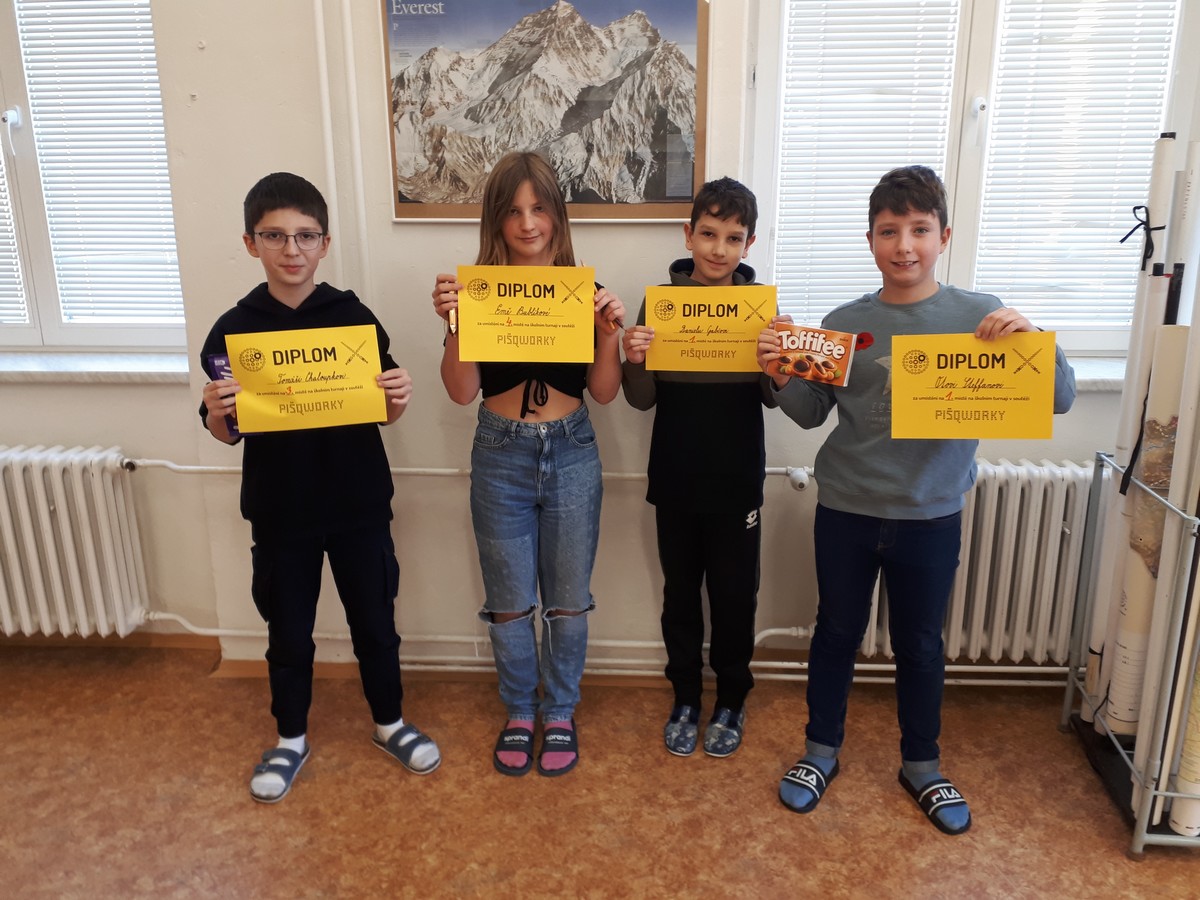35 páťáků se rozhodlo změřit síly se svými spolužáky ve školním turnaji v piškvorkách. Soutěž postupně opouštěli hráči, kterým se zrovna nedařilo. Do finále se nakonec probojovali Daniel Gabčo a Ota Steffan z 5.B, kteří byli tak vyrovnaní, že ani po šesti vzájemných duelech nebylo rozhodnuto o vítězi, takže nakonec oba odešli s diplomem za první místo. Druhý stupínek tedy zůstal neobsazen, třetí příčku vybojoval Tomáš Chaloupka z 5.A a na čtvrtém místě skončila Ema Bublíková z 5.B.