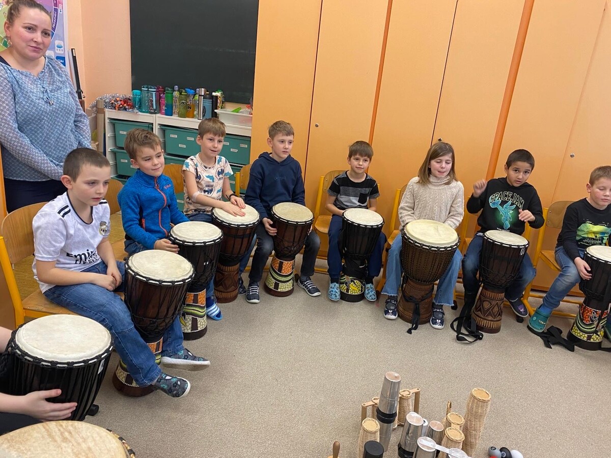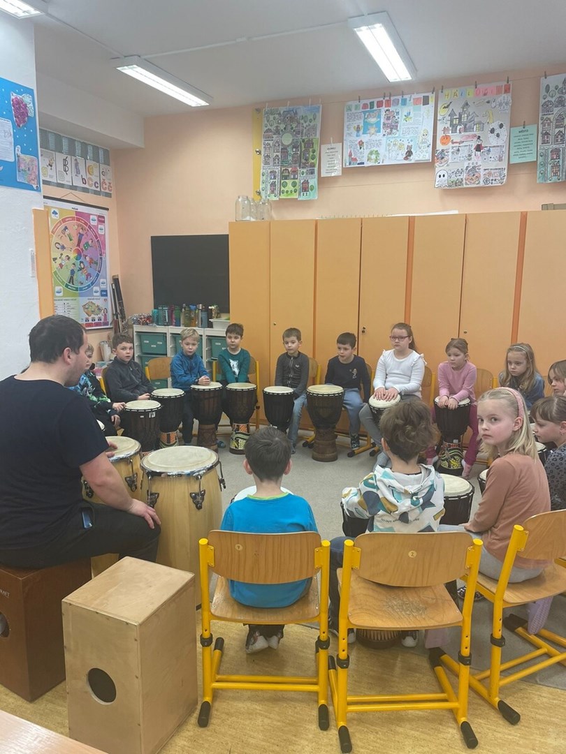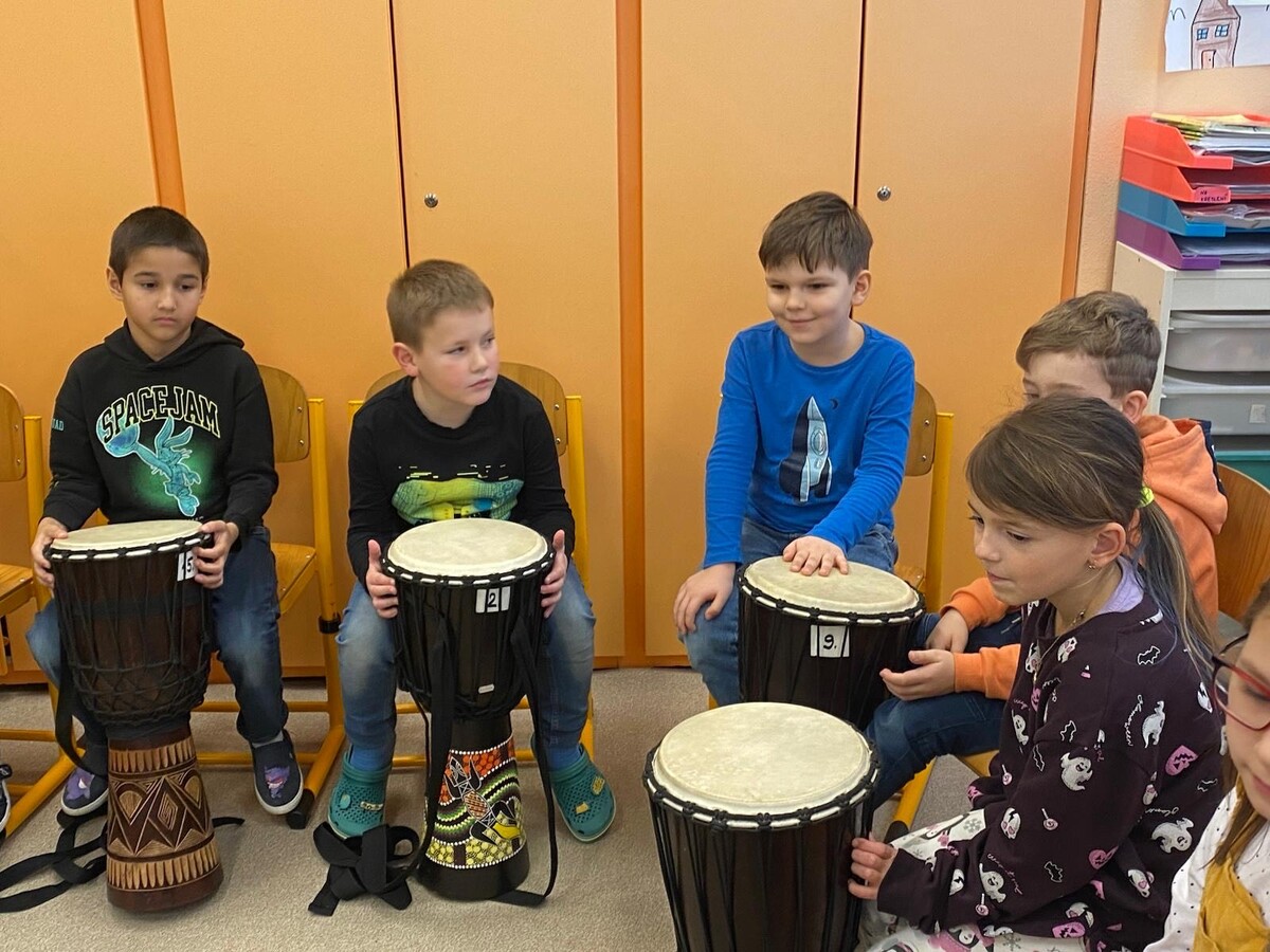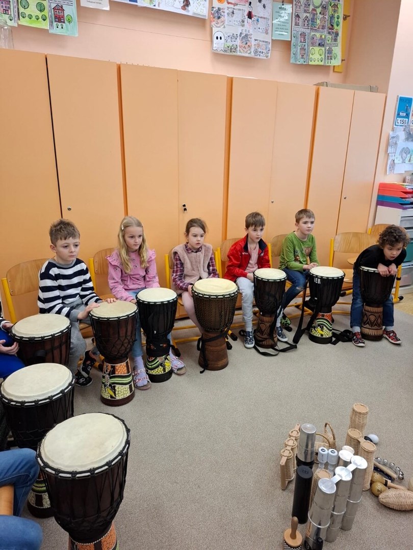 V pátek 10. ledna měli žáci 1. a 2. ročníku naší školy příležitost seznámit se v rámci hudební výchovy s typickým lidovým hudebním nástrojem, na který hrají obyvatelé západní Afriky- s bubny zvané djembe. Hru na ně si sami vyzkoušeli a šlo jim to velmi dobře. Cílem bylo, aby si děti zkusily zahrát ve skupině, spolupracovat, poslouchat se, být všichni ve stejném rytmu. Od února tohoto roku se pro některé žáky hra na djembe naplno rozjede v nové učebně.