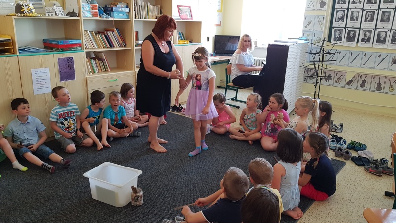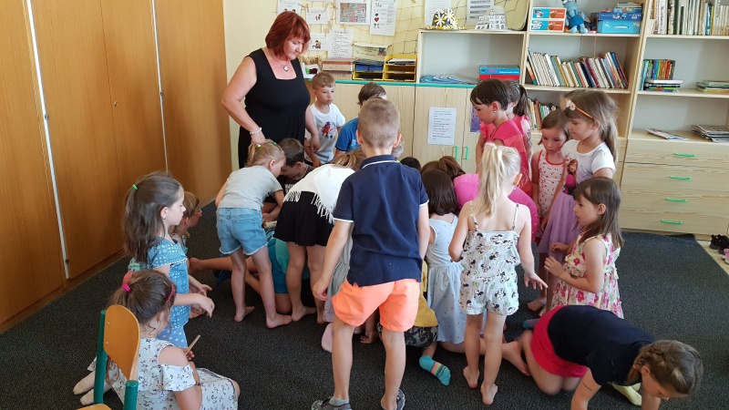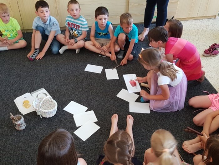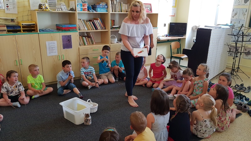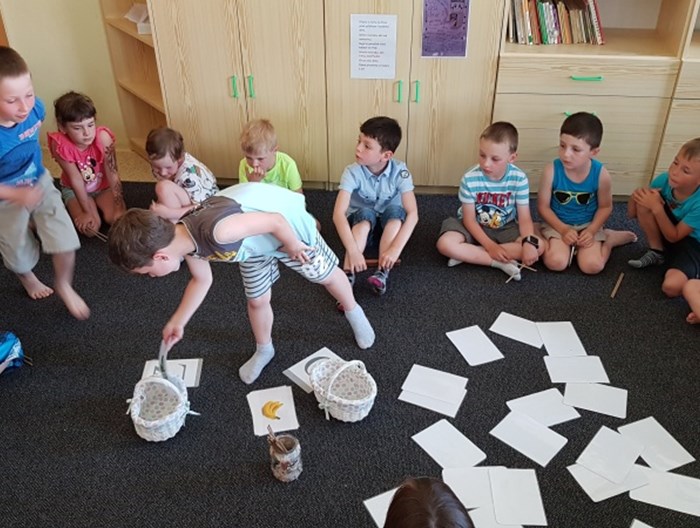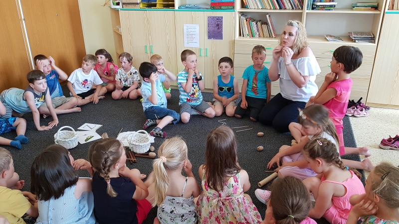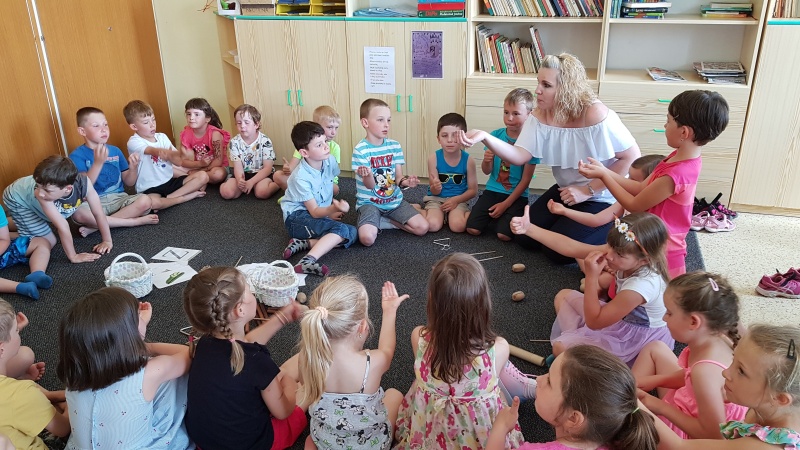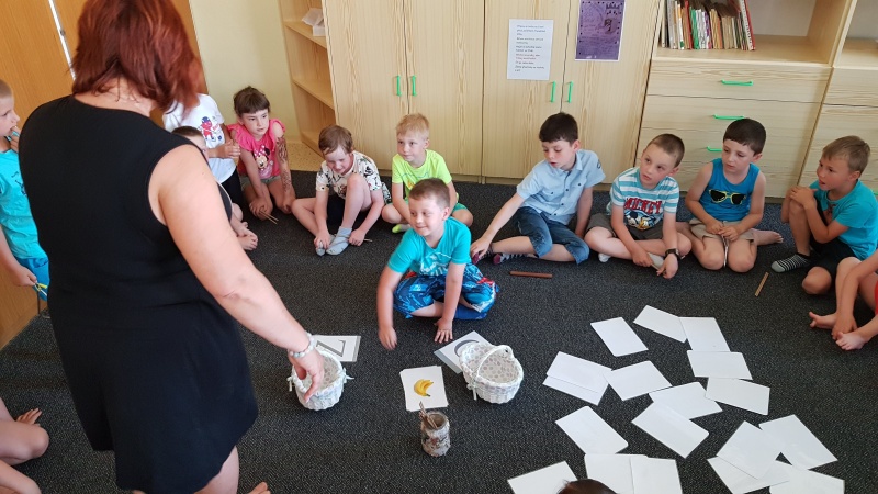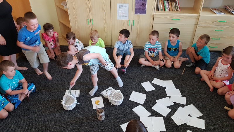 Zazpívali jsme si známé písničky, k rytmizování jsme využili Orffovy hudební nástroje a některé z písní děti ztvárnily pohybově. Zahráli jsme si na tržnici a do košíčků jsme třídili ovoce a zeleninu. Děti si také udělaly krátkou prohlídku školy.