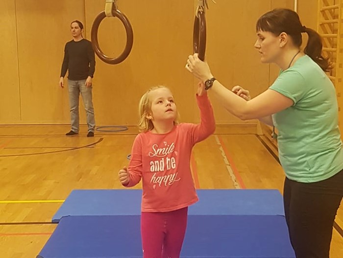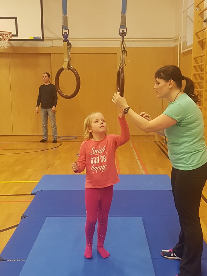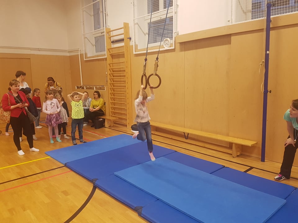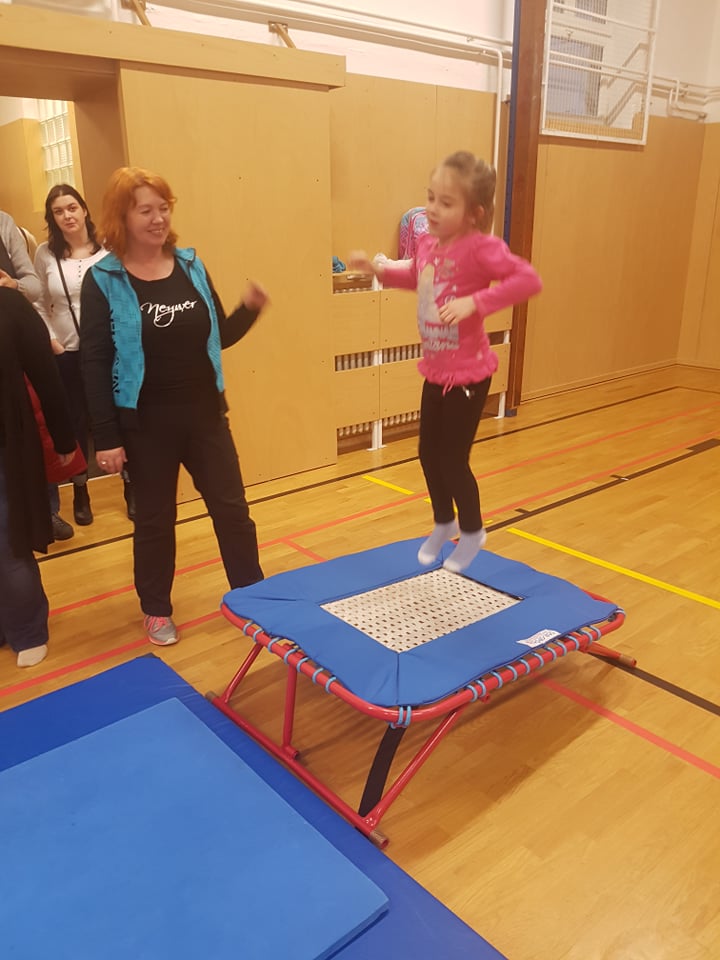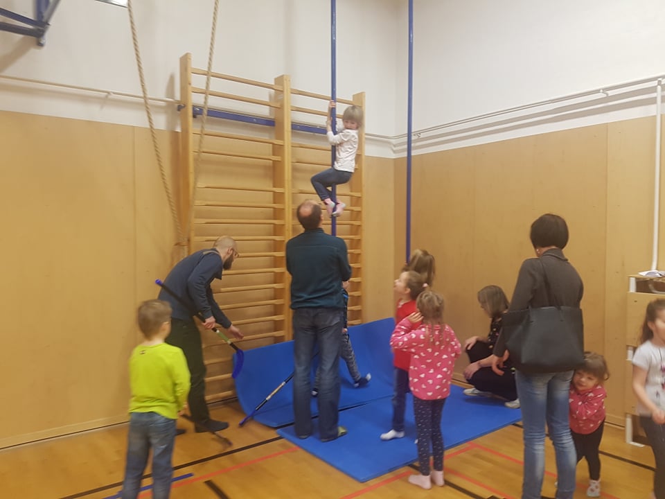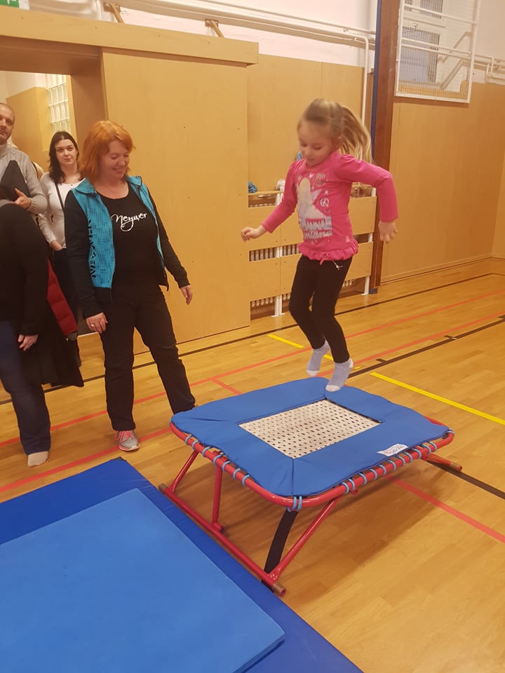 Dospělí se také s nadšením připojili do pohybových aktivit, které si spolu s dětmi užili v naší tělocvičně. Skákání na trampolíně, šplh, houpání na kruzích, házení míčem na koš i do branky odhalilo nejeden dosud skrytý talent.