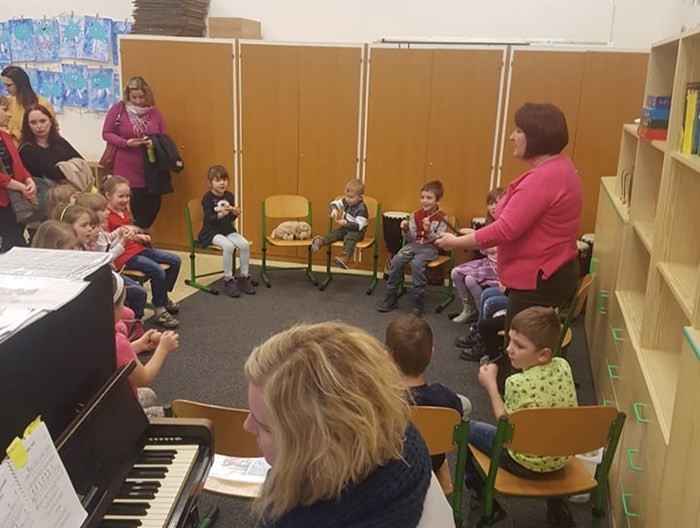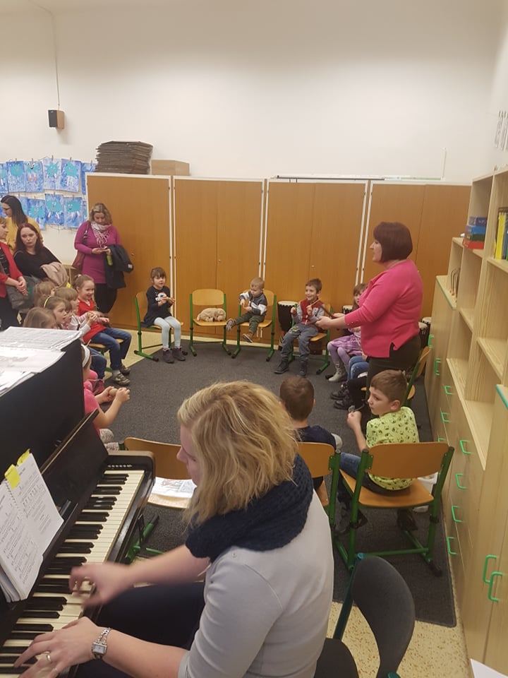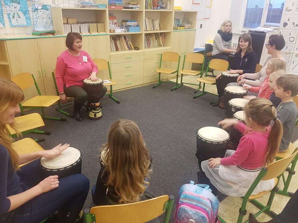 Na dalším stanovišti bylo připraveno rytmizování, zpívání známých českých dětských písniček a jejich doprovod hrou na tělo, rytmickými nástroji a pohybem. Do tohoto „hraní“ se zapojily nejen děti, ale také dospělí a společně jsme si zazpívali a zabubnovali.