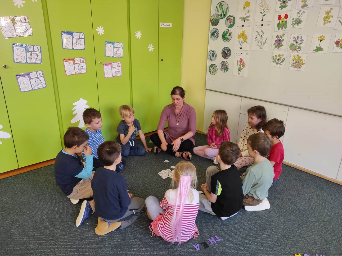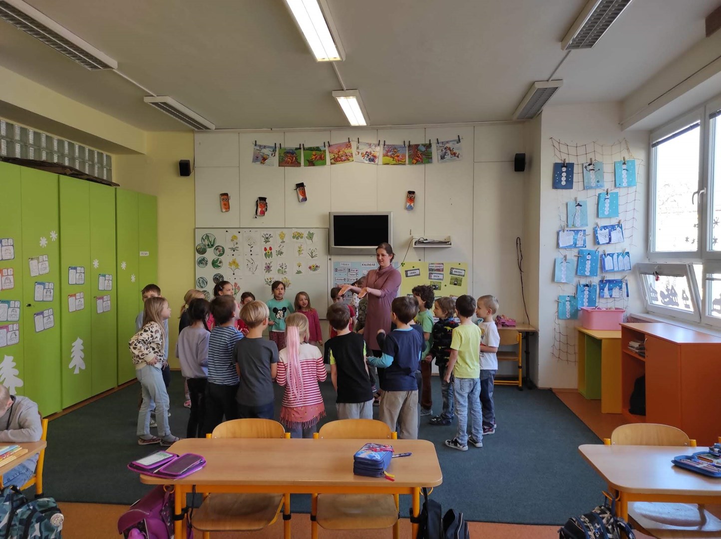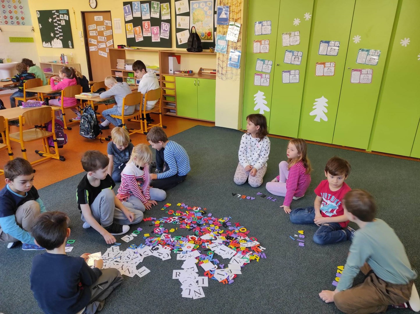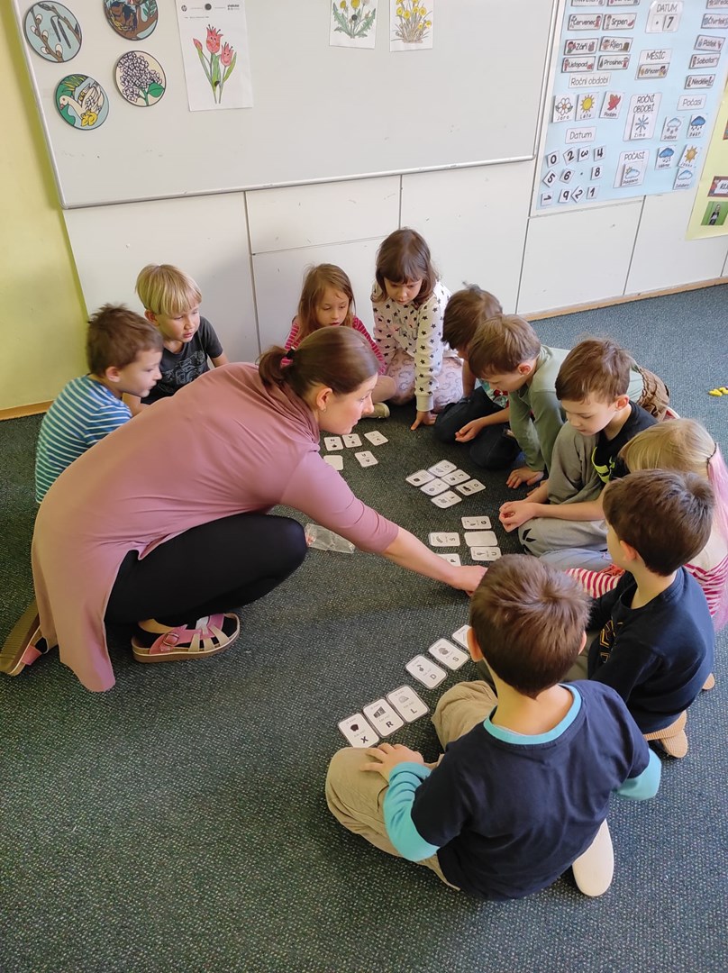 Společně jsme si zazpívali a zatančili, a pak už jsme se pustili do práce. V 1.A jsme společně skládali svá jména z písmen, hráli jsme hry se slovy, prvňáci četli a děti podle pokynů malovaly obrázek, společně jsme počítali květiny.