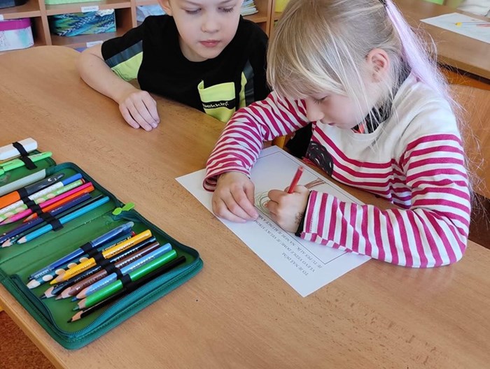 V 1.B předškoláci viděli, jak se děti učí nové písmenko Ž, naučili se básničku, vyzkoušeli si počítání, zpěv i namalovat obrázek.
