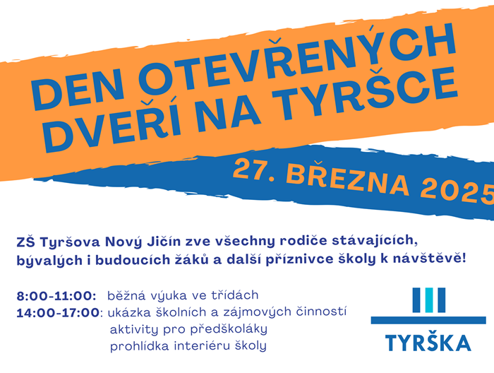 ZŠ Tyršova Nový Jičín zve rodiče současných, bývalých i budoucích žáků a všechny další příznivce a přátele naší školy na Den otevřených dveří. Ten se uskuteční ve čtvrtek 27. března 2025.