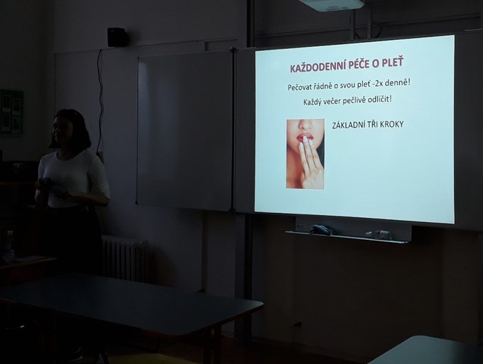Ve čtvrtek 19. května 2022 absolvovaly dívky z 9.B a 9.C přednášku s praktickými ukázkami s názvem „Šminky vs. Krémy aneb Co je důležité pro naši pleť“, kterou si pro ně připravila vizážistka Jana Maralíková.
