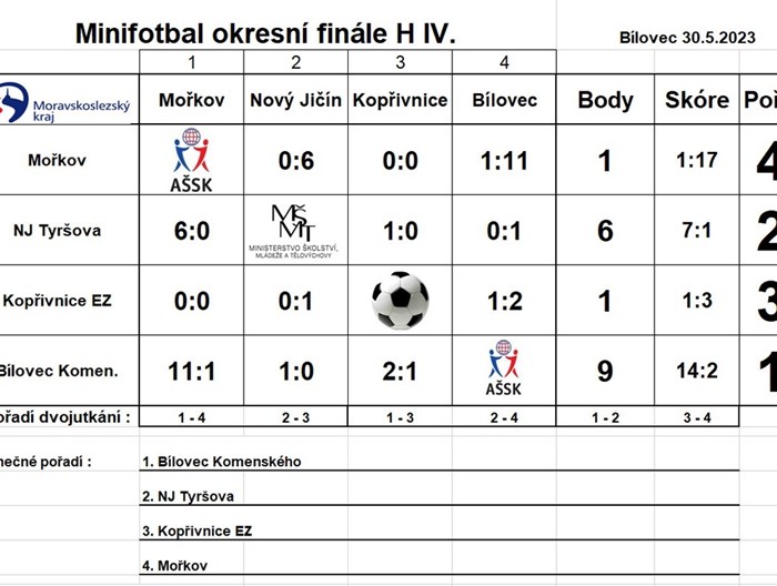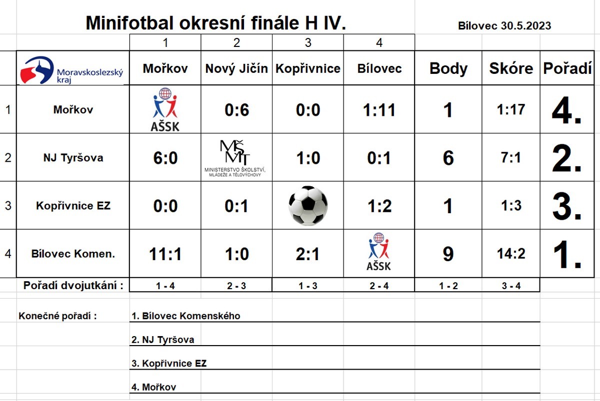 V úterý 30. května proběhlo v Bílovci okresní finále. Po výhře nad ZŠ Kopřivnice, Emila Zátopka 1:0, jsme stejným poměrem podlehli chlapcům ze ZŠ Bílovec Komenského, jenž byli velkými favority na vítězství.
