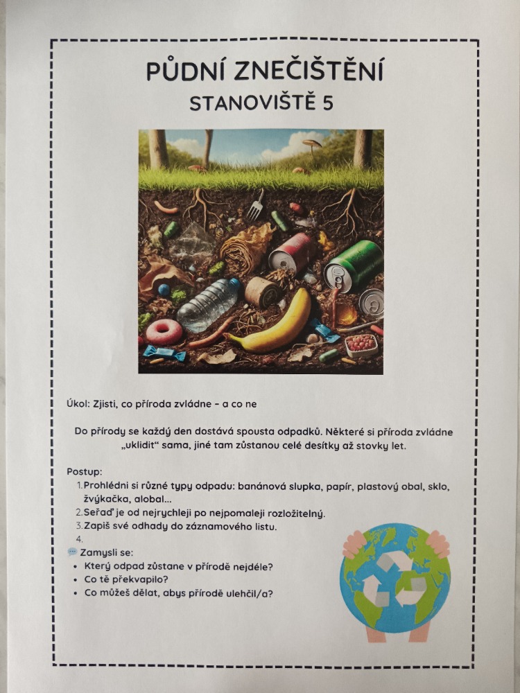 Žáci na jednotlivých stanovištích plnili úkoly, ve kterých uplatnili své dovednosti kritického myšlení a navrhovali řešení, která by pomohla lépe chránit přírodu. Některé nápady si sami prakticky vyzkoušeli.