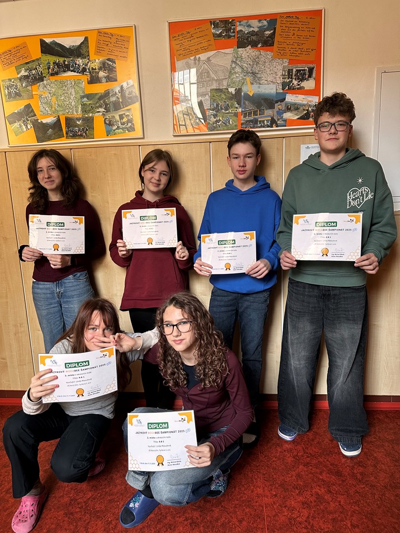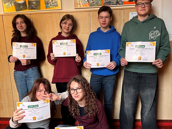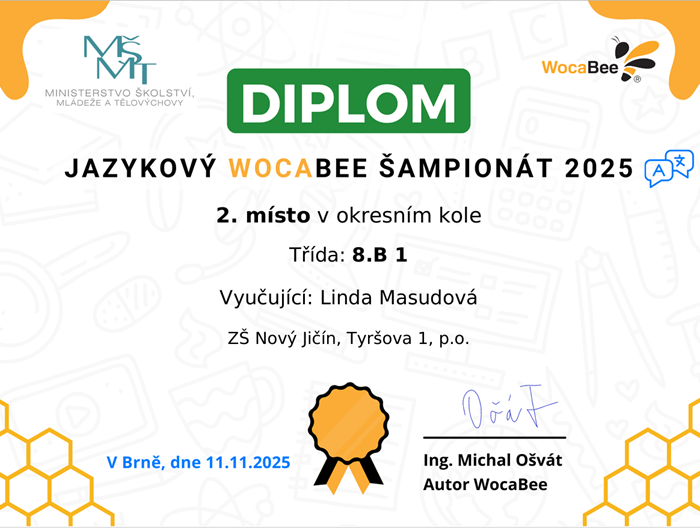 Okresní kolo jazykového šampionátu s aplikací na učení slovíček WocaBee probíhalo od 5. do 9.11.2025. Třídy soutěžily jako tým a každý žák měl k dispozici celkově max. 2 hodiny procvičování. Žáci třídy 8.B se v okresním kole umístili na krásném 2. místě a postoupili do krajského kola, které probíhá od 12. do 14. 11. 2025. Průměrný počet bodů na žáka v 8.B byl 937 bodů. Žáci vyhráli kromě diplomů i prodloužení platnosti aplikace o 1 měsíc. Moc gratulujeme a držíme pěsti v krajském kole!
