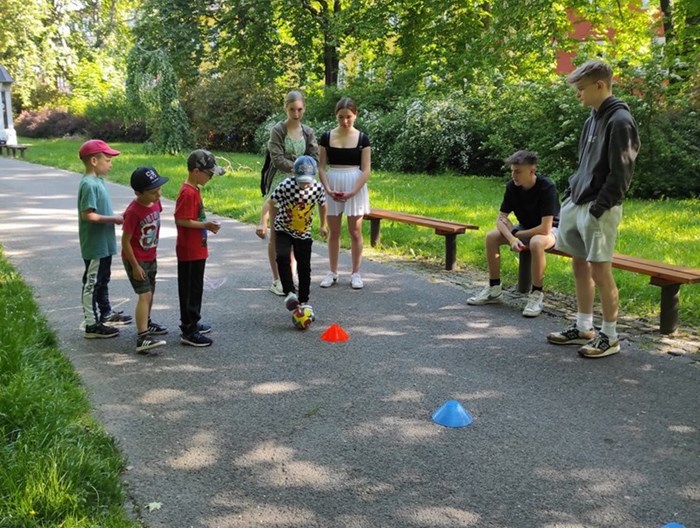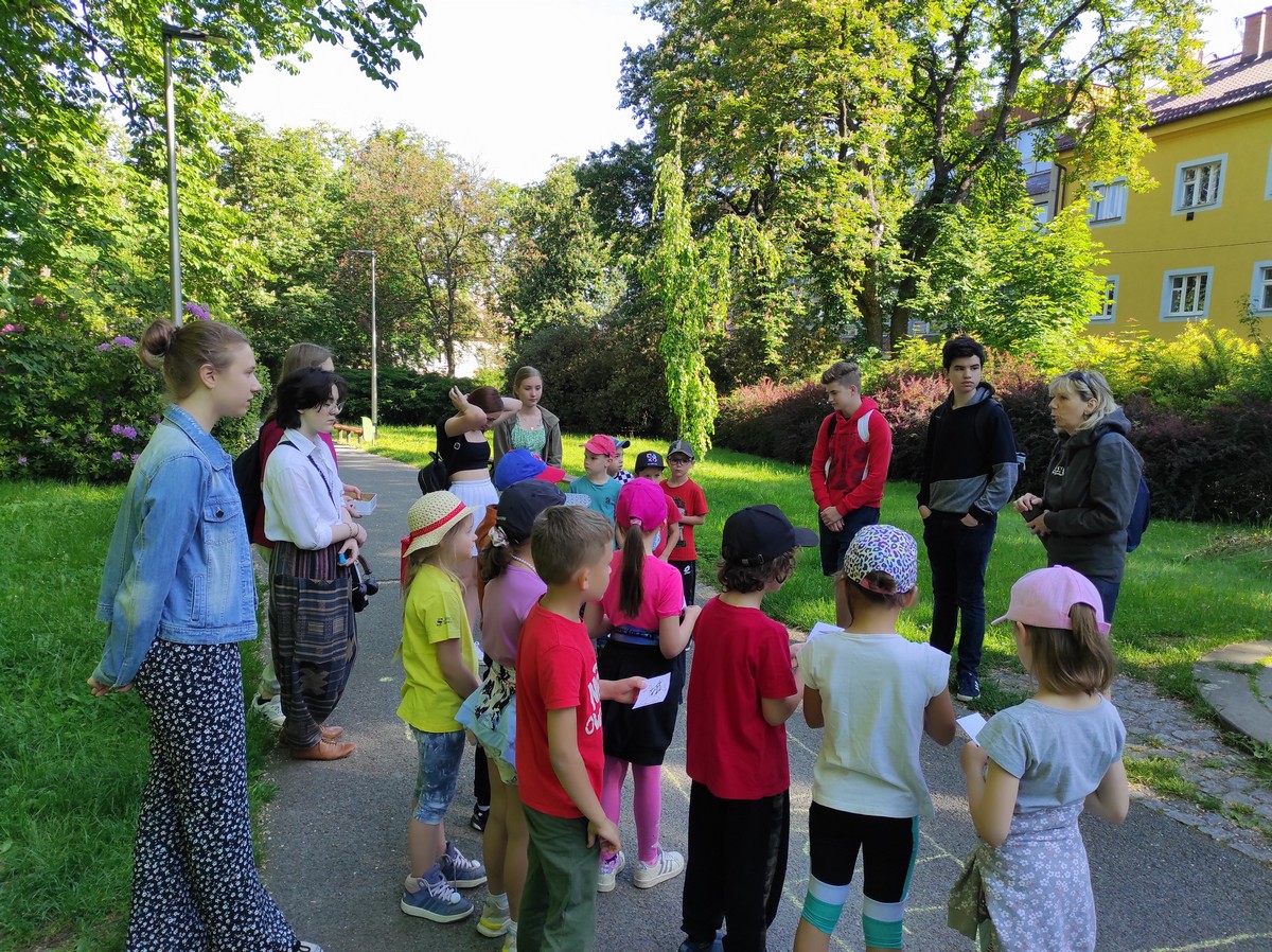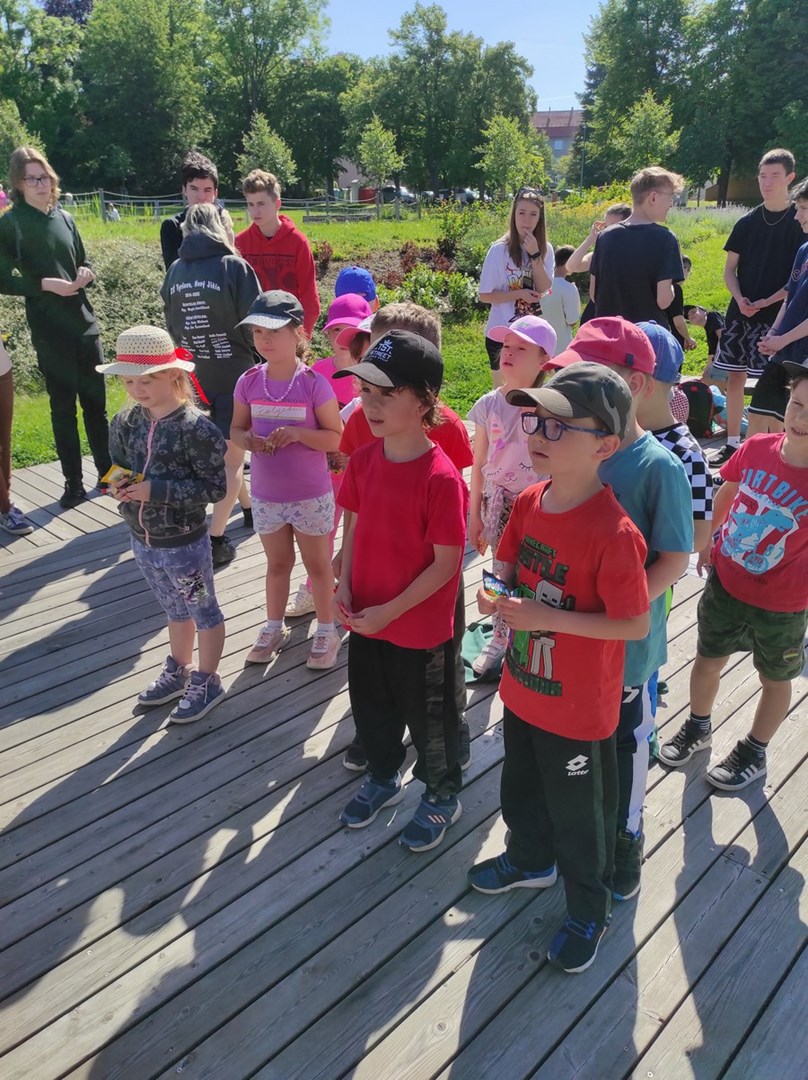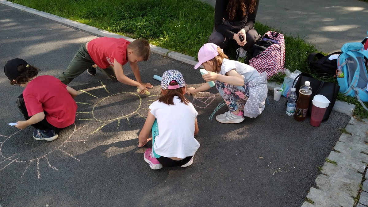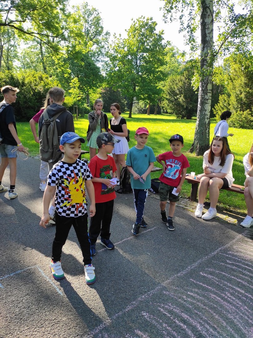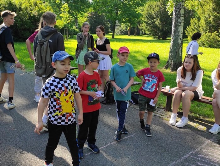 Ráno jsme se sešli ve Smetanových sadech, kde začínala naše trasa. Týmy postupně procházely parkem a cestou plnily nejrůznější úkoly. Největší úspěch měla disciplína s přenášením vody. V cíli na prvňáčky čekalo vyhodnocení soutěží a odměna ve formě dobrot. Nechybělo ani dětské šampaňské. Děti si pak chvíli odpočinuly u společenských her, ale to jen proto, aby nabraly síly na další aktivity. Kluky čekal fotbalový zápas. Velcí si vzali na starost malé a vznikla nám dvě smíšená družstva. Netradiční utkání mělo u všech fotbalistů veliký úspěch. Holky se věnovaly pletení věnečků z kopretin a nakonec si zahrály živé „Člověče, nezlob se".
