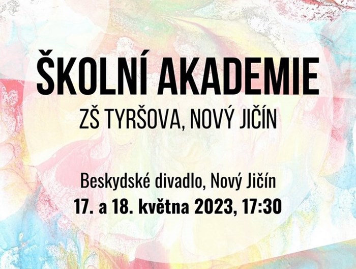 Žáci a učitelé ZŠ Tyršova v Novém Jičíně vás srdečně zvou na slavnostní školní akademii, která se koná 17. a 18. května 2023 od 17:30 v Beskydském divadle. Těšit se můžete na pestrá kulturní čísla žáků prvního i druhého stupně naší školy (divadlo, hudba, tanec a další), která děti aktuálně pilně nacvičují. Vstupenky je možné zakoupit už od úterý 18. 4. 2023 od 14:00 na pokladně Beskydského divadla, ve stejný den také od 18:00 online na webu www.beskydskedivadlo.cz. Přijďte podpořit naše žáky a užít si spolu s námi kulturní zážitek. Těšíme se na vaši návštěvu!