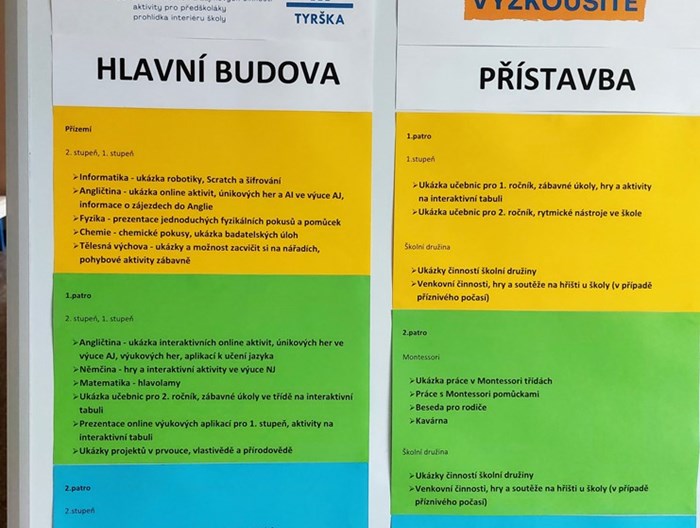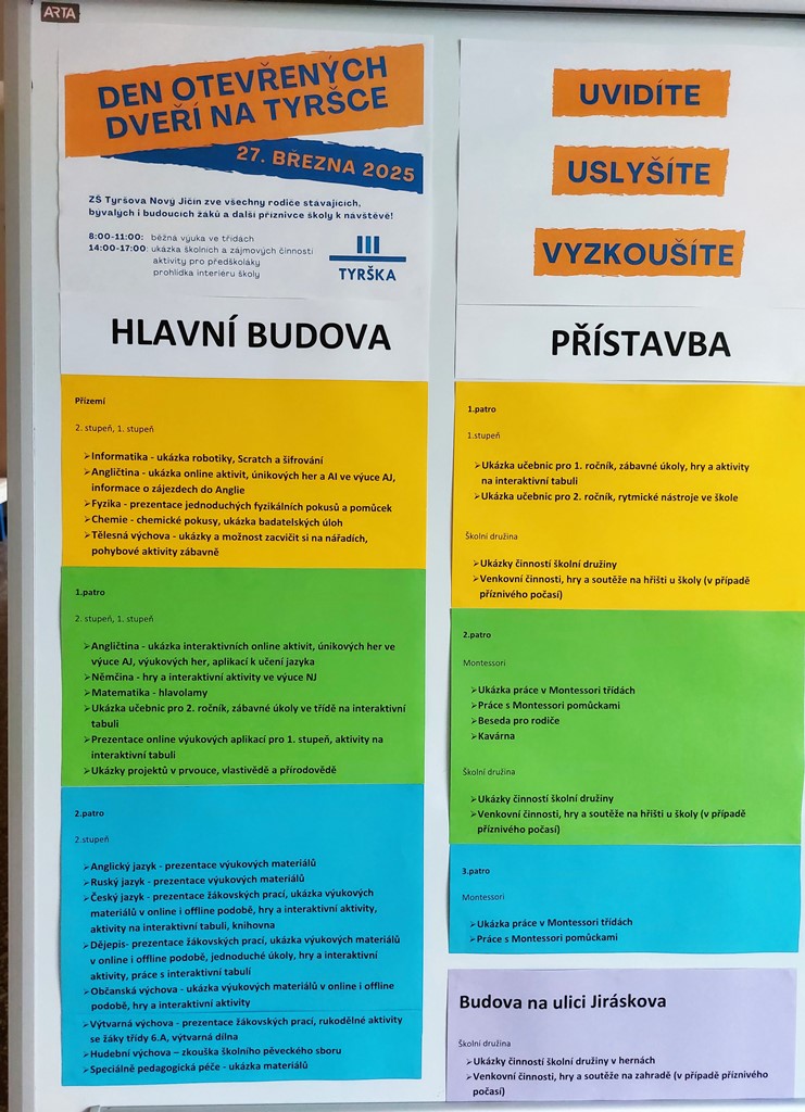 Ve čtvrtek 27. března 2025 proběhl v naší škole tradiční Den otevřených dveří. Stejně jako v předcházejících letech, i tentokrát byl rozdělen do dvou bloků. Budoucí prvňáčci, jimž se blíží dubnový zápis do prvních tříd, se tak mohli se svým dospělým doprovodem podívat na Tyršovku jak v dopoledních hodinách (omrknout atmosféru vyučovacích hodin v jednotlivých třídách), tak odpoledne. A samozřejmě nejenom oni.