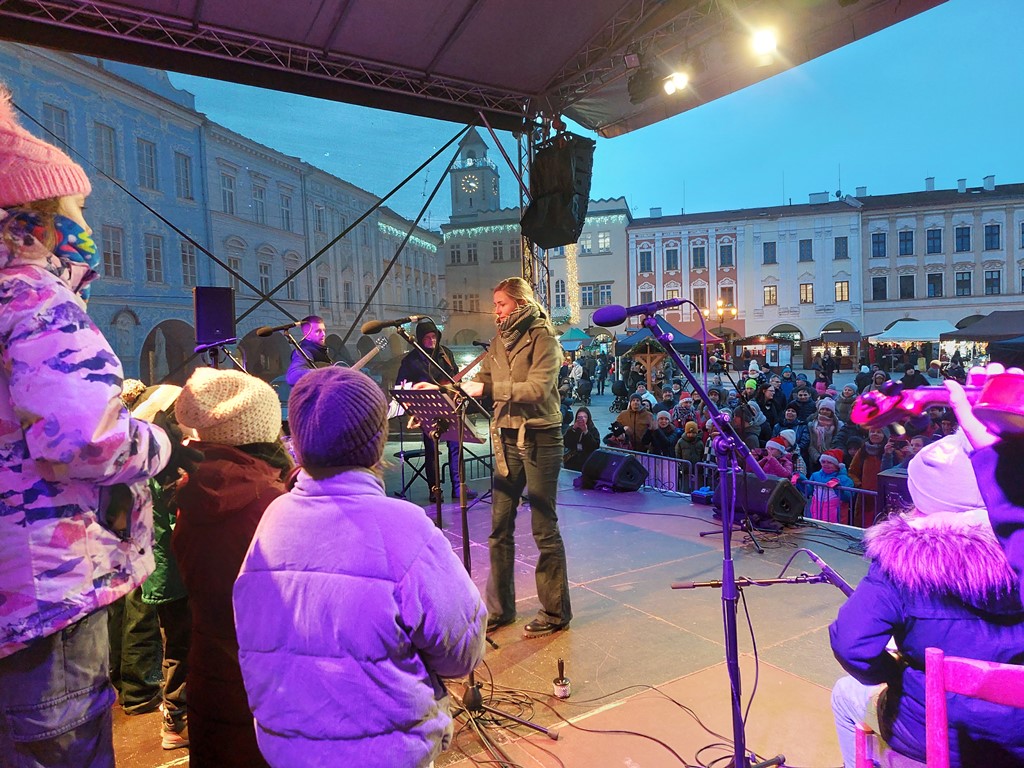 Po milém vystoupení flétniček pak pódium patřilo pěveckému sboru vedenému paní učitelkou Evou Červenkovou, který tvoří dívky a chlapci z 1. i 2. stupně základní školy. Holky a kluci za doprovodu dobře šlapající kapely zazpívali řadu vánočních písní, ve finále samozřejmě nechyběly ani tradiční koledy. Bylo velmi milé sledovat, jak se ke zpěvu – a mnohdy i tanci – připojuje také skvělé publikum.